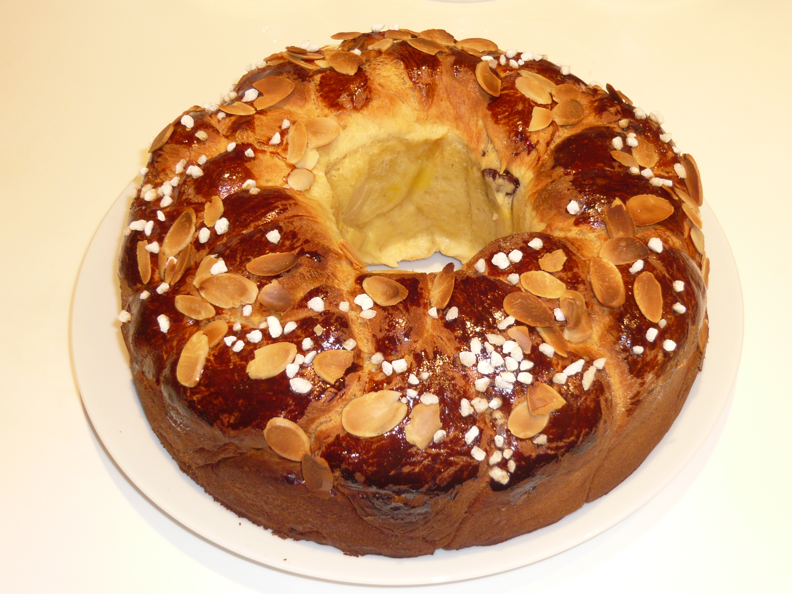 Heat the oven to 200C. Mix the egg and milk and glaze the cake evenly. Sprinkle over the granulated sugar and the flaked almonds and bake for 50-60 minutes. You might need to cover the cake with some tinfoil to prevent it from turning too dark.