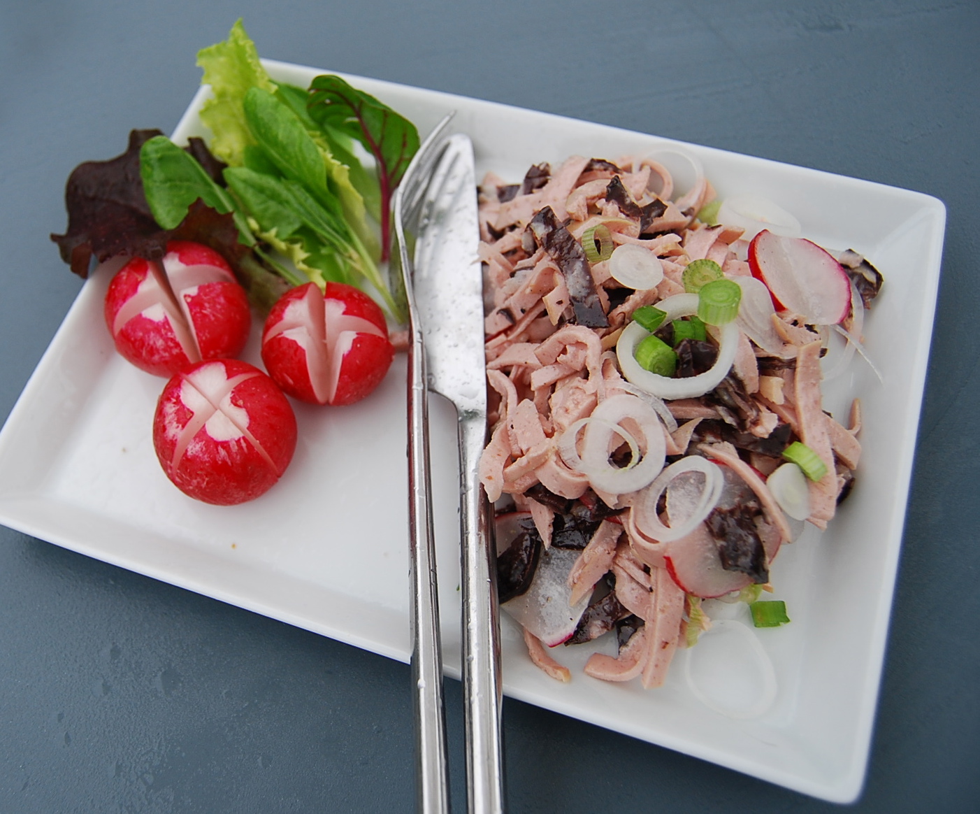 Cut the sausage slices into fine strips. Add some of the spring onion slices and radishes and mix with the vinaigrette. Llet it rest in the fridge for at least 30 minutes.