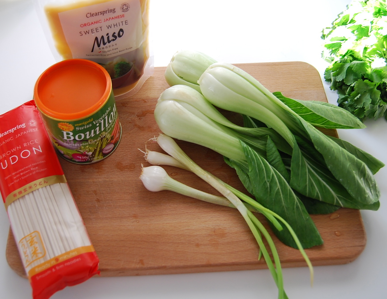 Pour the hot water into the pan, then mix in the bouillon powder and miso paste. Add the green leaves of the bok choi and the spring onions as well as the noodles. Simmer but don’t let it boil as it will change the flavour of the miso.