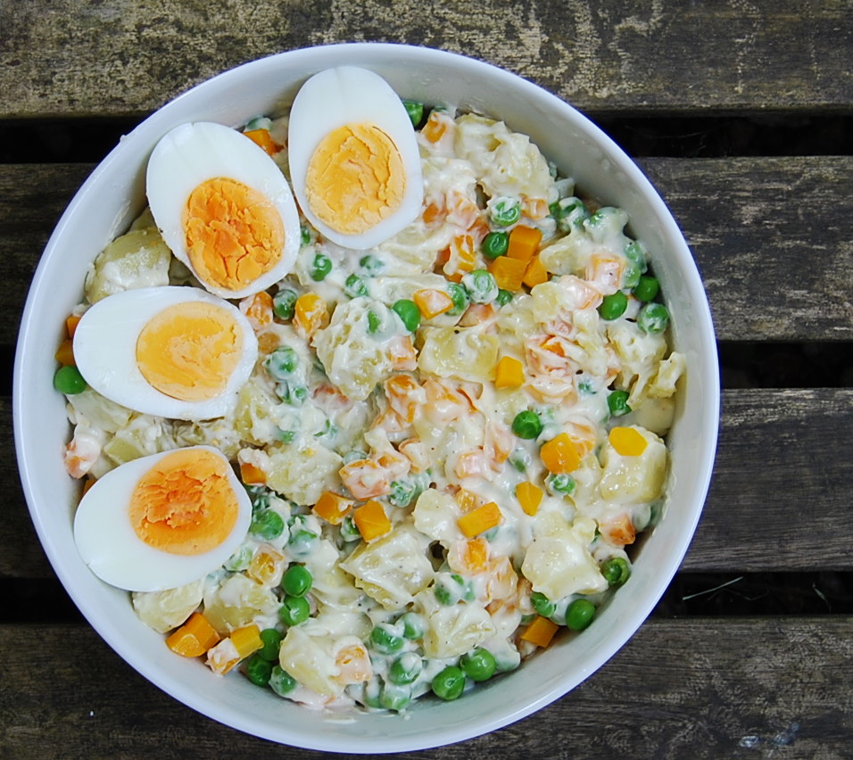 The historical version probably included all sorts of delicacies, from game birds via veal tongues to caviar, which are hard to come by if you don’t have the spending money of an oligarch. The basic version of this popular dish includes potatoes, carrots, peas, hard-boiled eggs and mayonnaise, with chicken, mince meat, apples and gherkins as regional (or personal) variations. I stuck to the basics in order to placate fussy eaters; I’m fine without the meat but would have loved to add gherkins and even half an apple. The following quantities, therefore, are just to give you a rough idea of what you need to get to the version on the picture – ideally you adjust quantities – as well as ingredients – to suit your tastes!