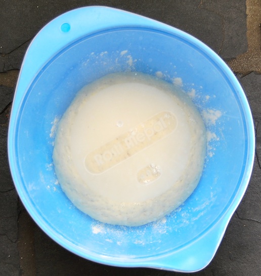Mix the ingredients to a firm dough: with yeast, the dough eventually forms a relatively firm ball that might even display rather large bubbles when your knead it. Cover and let it rest until it has doubled in size. This takes around 2 hours.