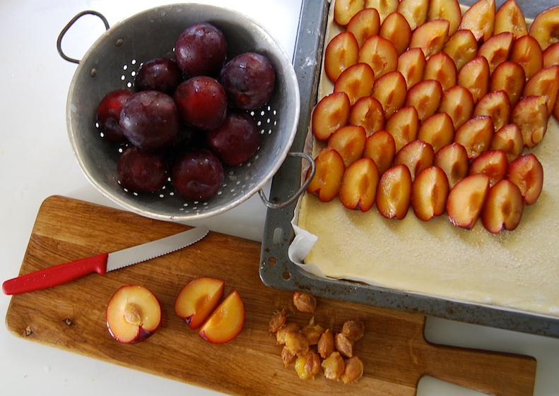 Cut the plum halves once more, lengthwise, as far as you need to open them up a little bit; place them in straight lines, the second row slightly overlapping the first, like roof tiles. The closer you place the plums to the end the smaller your edge will be (good to know if you are one of those people who don’t like the edge of their pizza …) .