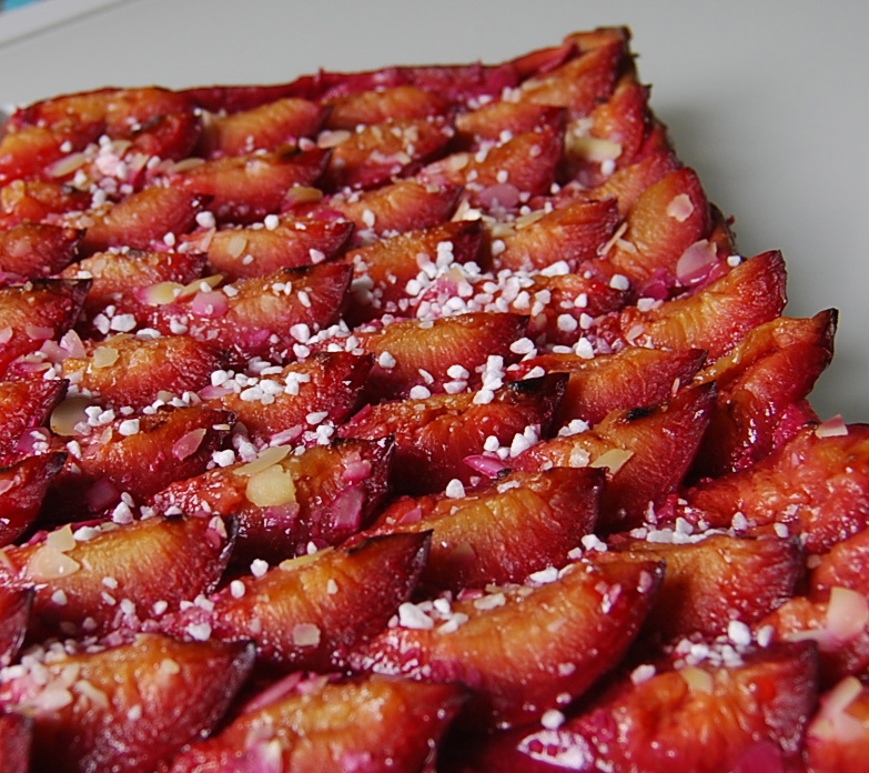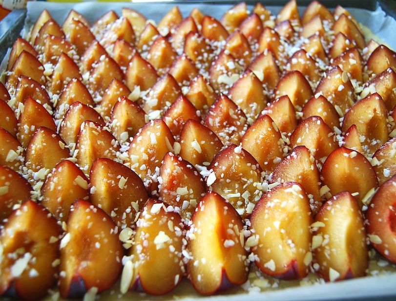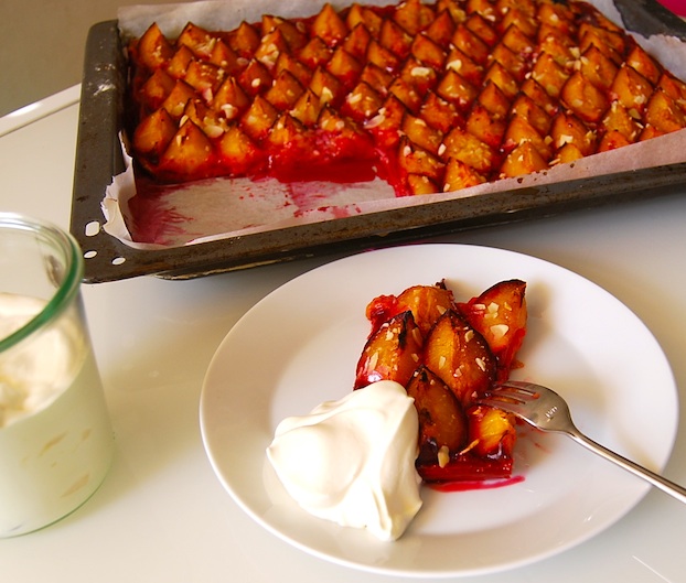 I have used a simple yeast dough for the base, the same I would use for another traybake, apple crumble. The plums I simply topped with cinnamon, sugar and flaked almonds, but crumbles are also quite common, in particular crumbles made of stale sourdough bread, grated and mixed with sugar and cinnamon, to complement the tartness of the fruit. Whatever you do in terms of a topping, don’t forget to add the cinnamon as it complements the plums perfectly.