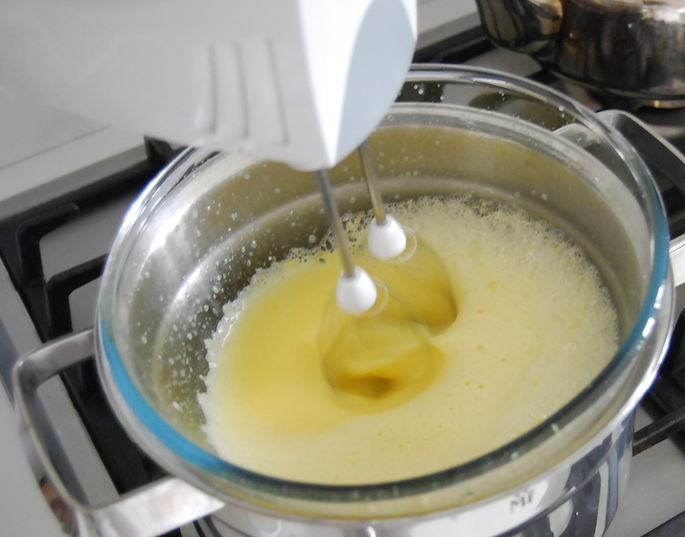 Begin by beating the egg yolks with the elderflower cordial in a bainmarie, until it is quite hot (use a clean finger to check – and remember to wash it after each test!). It will almost double in size but you need to keep beating (sorry!)