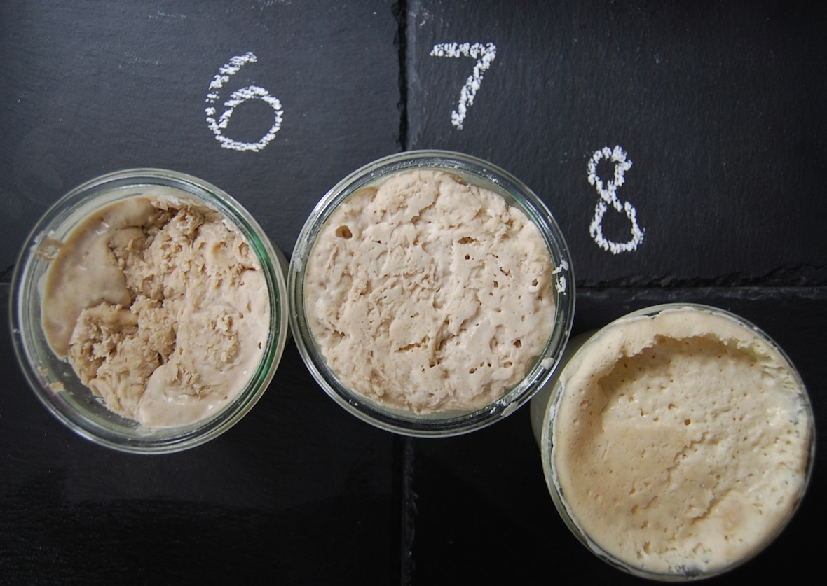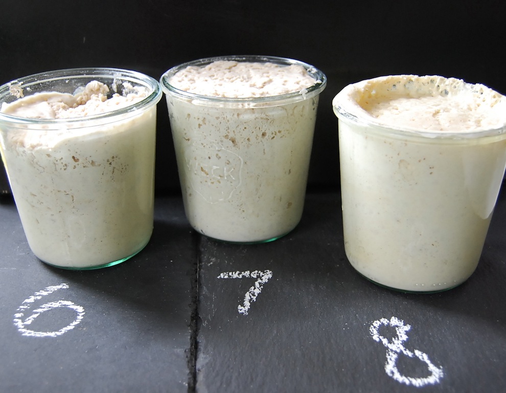 Um Euer Anstellgut müßt Ihr Euch übrigens keine großen Sorgen machen: im Kühlschrank kann es auch schon mal ein paar Wochen ruhen (ich habe es auch schon mal ein paar Monate vergessen…). Einfach füttern und abwarten: nach 8 Stunden habt Ihr wieder einen fröhlich vor sich hinblubbernden Levain!