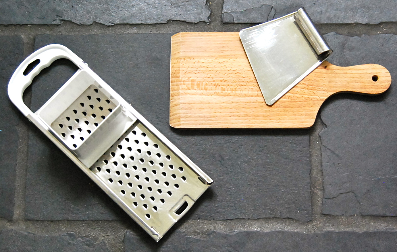 On the left I have a ‘Spätzleschwob’, the closest to a Spätzle-machine you can get: here the batter is filled into the plastic frame and then pushed through the holes in the metal ‘grater’, but more of that later. I have seen people make Spätzle using a knife, and any thin board with a handle and a pastry scraper will do the trick. All you need is some fine-motoric skills, some upper-body strength, and determination.
