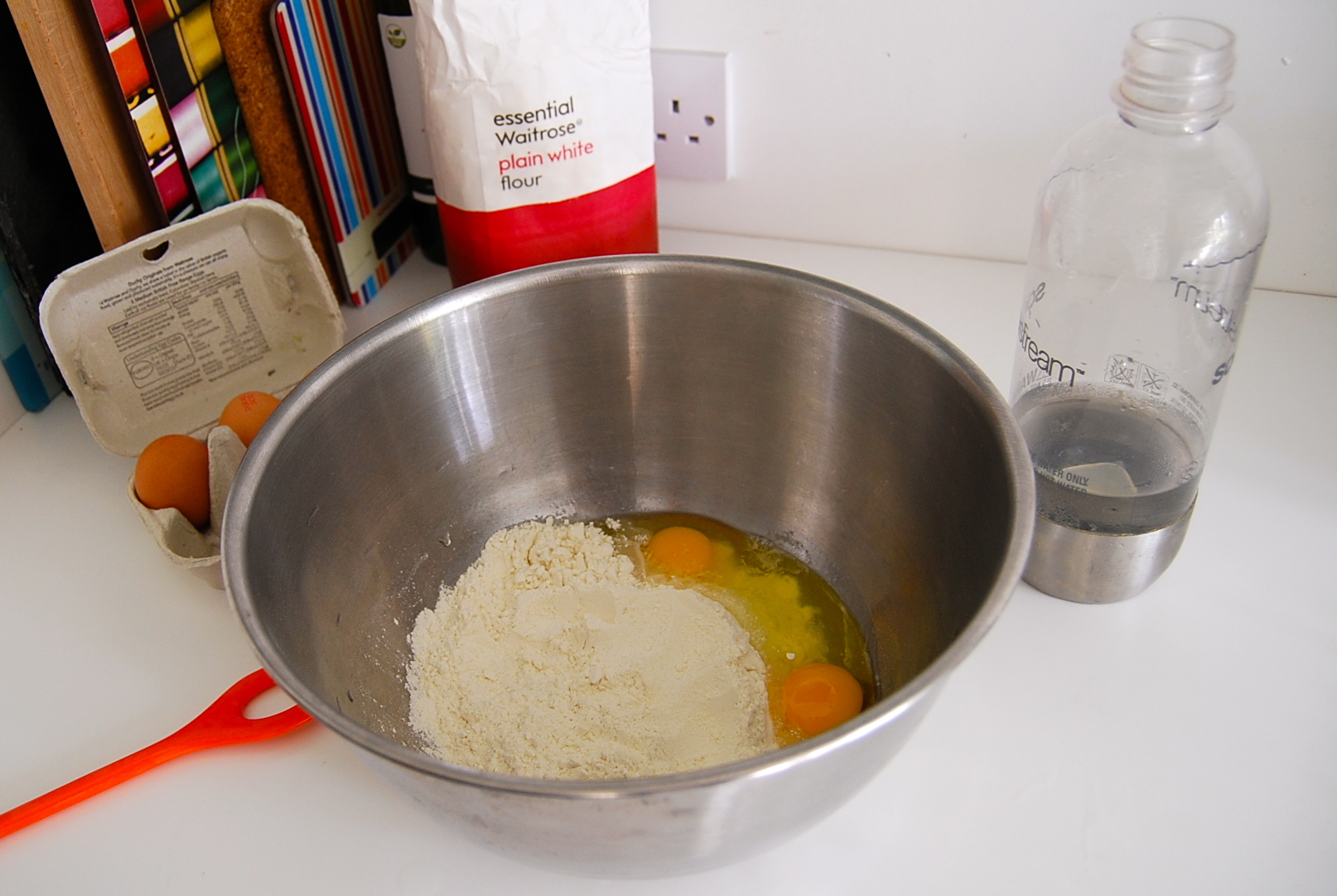 As mentioned before, the recipe for the dough – or batter – is incredibly simple: as a side dish for two people you use one egg and 100g plain flour, some salt and enough water (I use sparkling water for added lightness) for a fairly thick batter.
