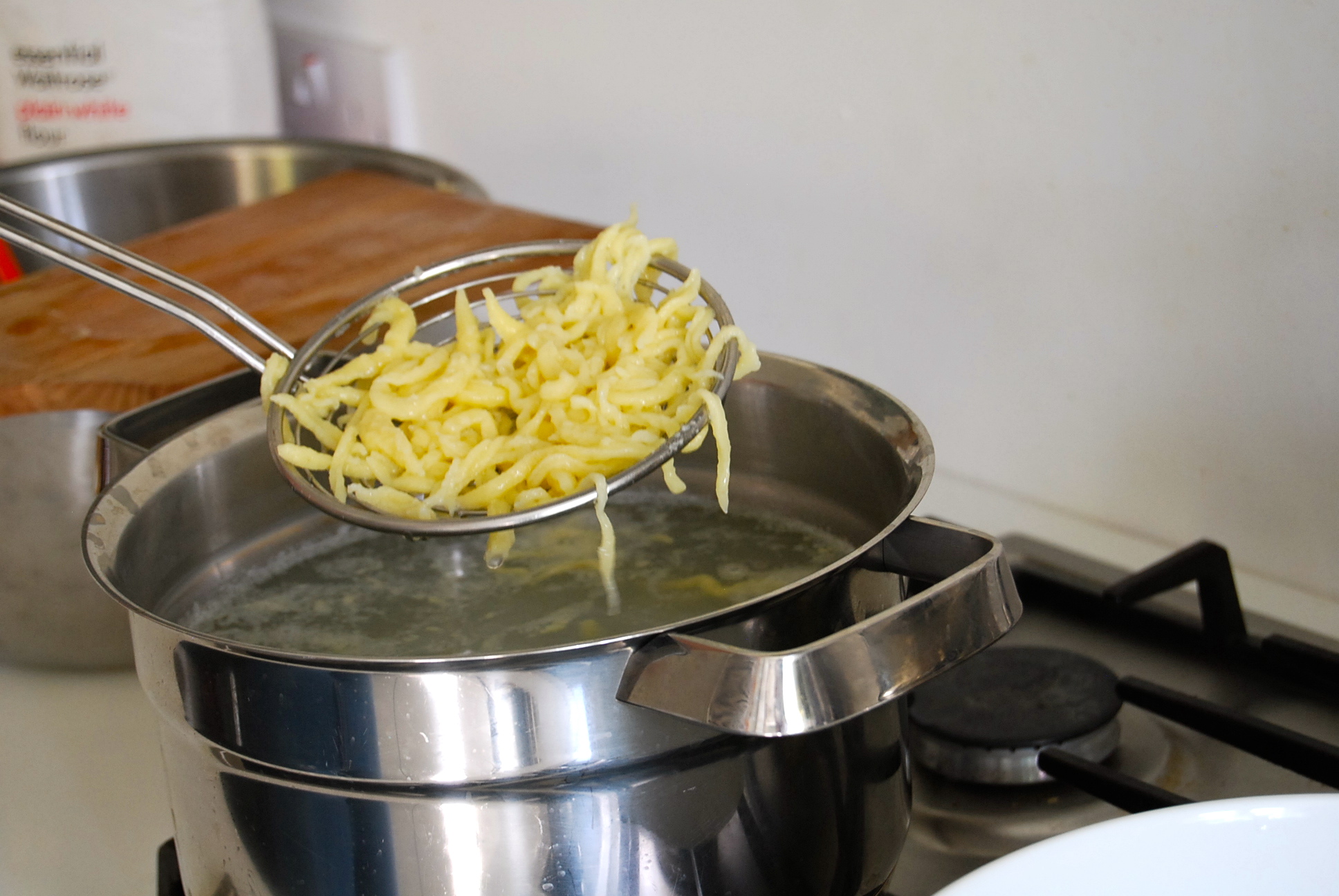 Betsy and Carly Ellen call them ‘dumplings’, whereas I can only ever think of them as ‘noodles’; in fact, Spätzle are possibly both, and therefore they are a dish like no other: incredibly light, they seem to melt on your tongue, especially when they have been freshly prepared. Although the ingredients are the same as for many other dumplings or noodles – flour, eggs, water and salt – the consistency of the dough is more like a batter. But perhaps the most remarkable aspect is the way in which Spätzle are made, as the individual noodles are scraped off a board, straight into boiling water.