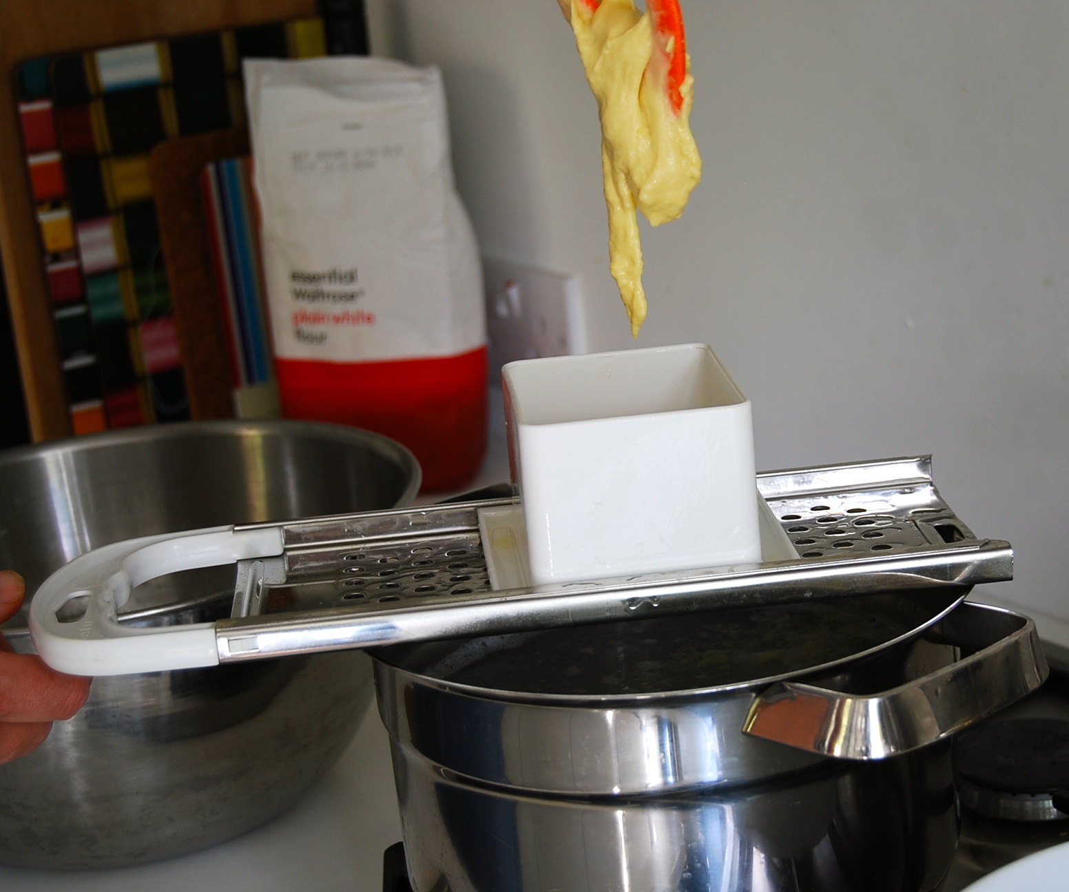 By moving the frame back and forth across a metal ‘grater’, the batter is forced through the holes and runs down in long drops: