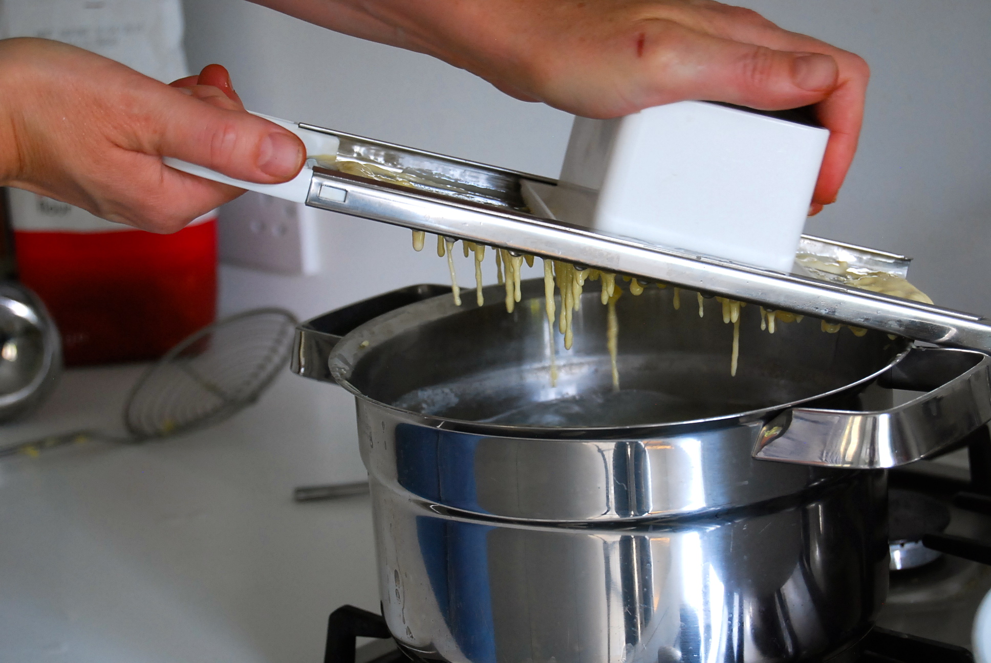 If you haven’t got a contraption like this, check out Crowded Earth Kitchen‘s post, where you can see how to use a simple sieve 🙂 In some regions these are then called ‘Knöpfle’, ‘little buttons’, to distinguish them from the more laborious Spätzle I presume.