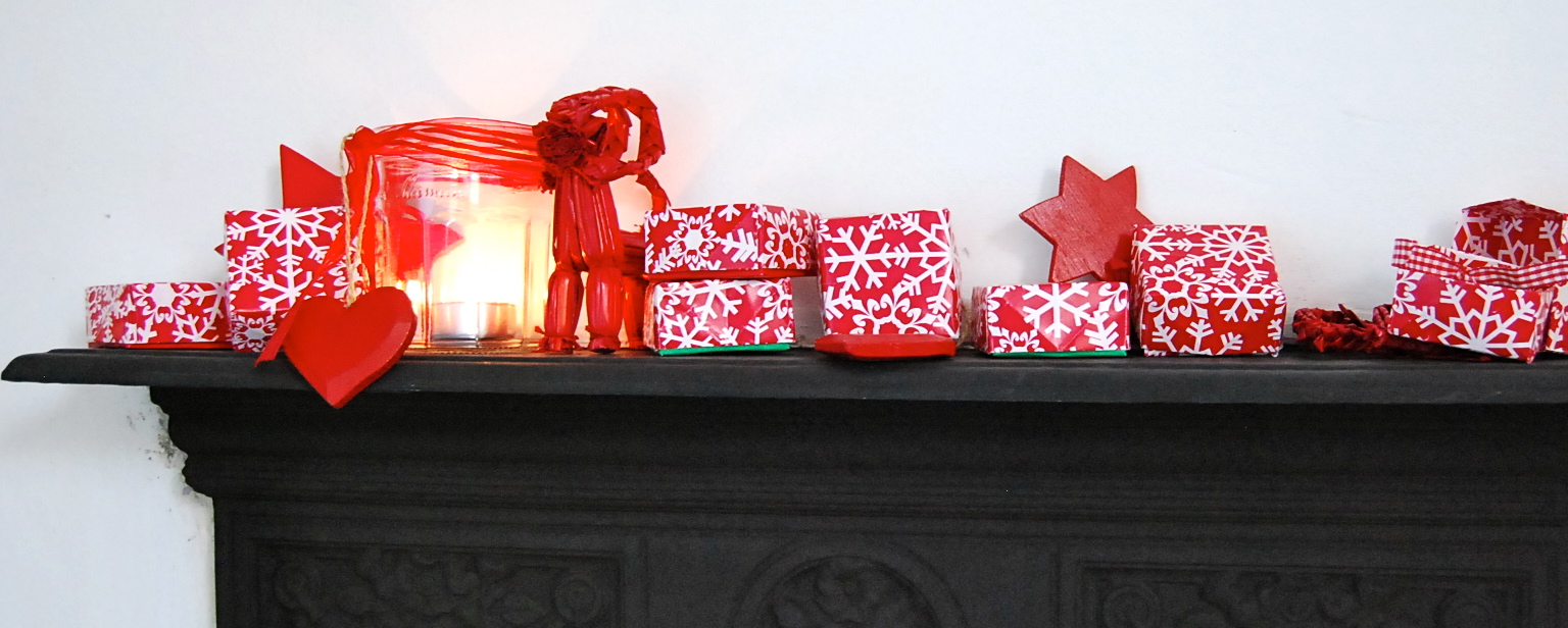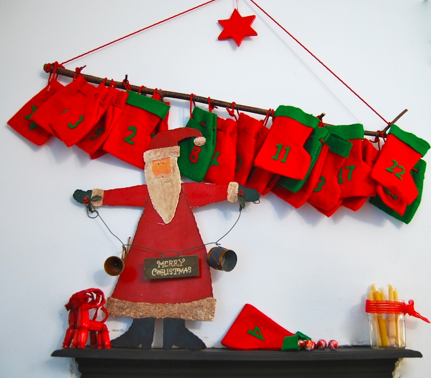 For my firstborn, I simply copied my mum’s idea of the little sacks when I made his calendar, over a decade ago. Instead of suspending it from an advent wreath, which I didn’t have space for, we use a pretty branch and suspend it over the fireplace:Advent calendar red and green