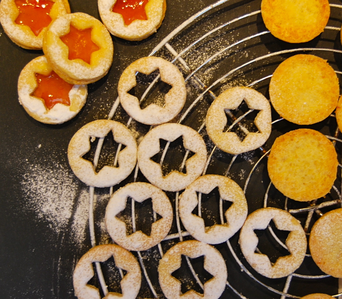 Heat up the jam in a small pot until it starts bubbling. Dust the rings with icing sugar, then spread jam on the bottom circles and assemble the biscuits.