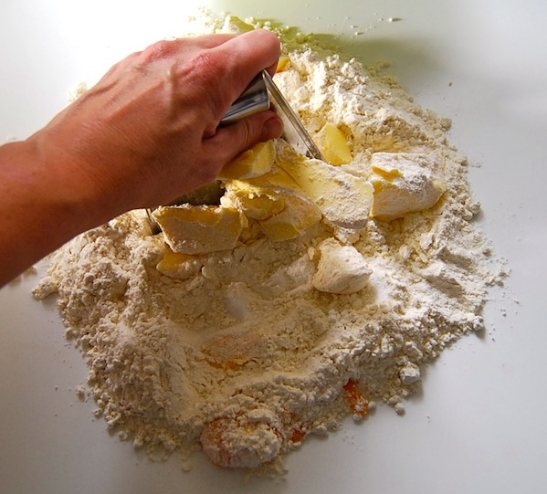 On your work surface, mix the ingredients for the dough as quickly as possible – as explained before, this buttery dough needs to be handled as little as possible.