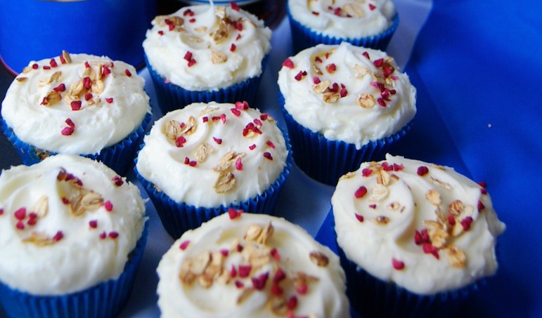 To prepare the frosting, use an electric mixer to mix the butter and sugar. Add the cream cheese and keep mixing, first at medium speed, then, when it is beginning to come together, with speed to create a light and fluffy frosting. Decorate the cupcakes with the frosting, finishing it off by sprinkling them with the dried raspberries and oats.