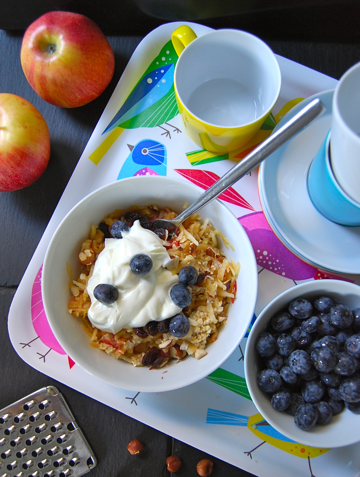 Just before serving, grate the apples into the oats and add the other ingredients.Bircher Muesli blueberry